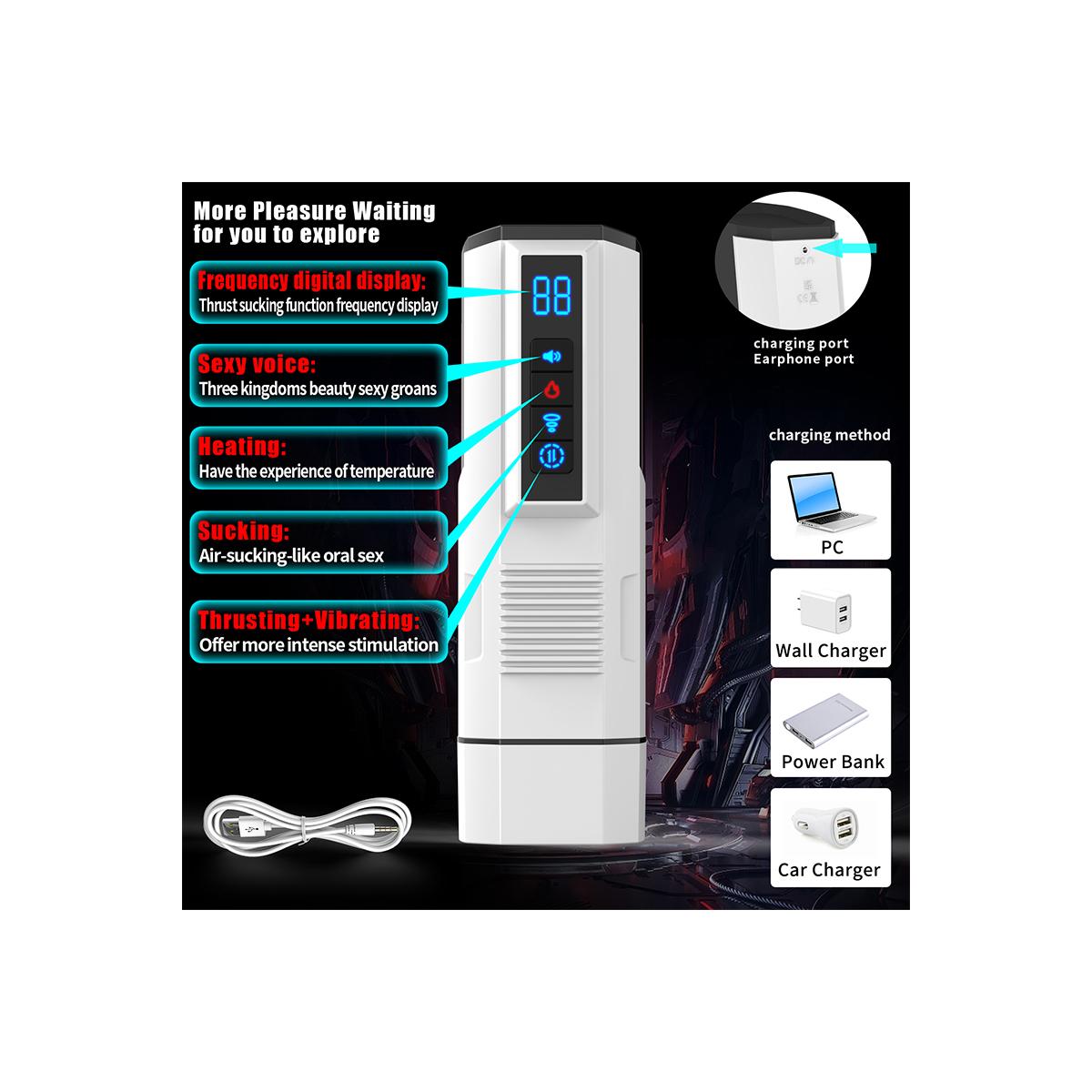 Çoklu orgazm için senkronize çalışan tam otomatik teleskopik ileri geri hareketler, mükemmel derecede sıkı emiş ve güçlü titreşim, akıllı tam otomatik indüksiyon(elektromanyetik ısıtma), 3 farklı dilde kadın inleme sesi, tam otomatik egzersiz, tam otomatik fonasyon ve uyum.